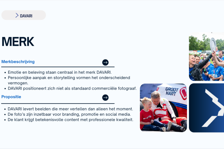 Verder is DAVARI een kleinschalige en jonge onderneming, opgericht in 2024. Hierdoor is er sprake van een persoonlijke en flexibele werkwijze. Klanten hebben direct contact met de fotograaf, wat zorgt voor korte lijnen, maatwerk en een aanpak die goed aansluit bij de wensen van de opdrachtgever.